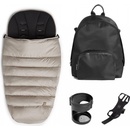 Sada doplnkov pre kočík Silver Cross Tide obsahuje luxusný fusak, štýlový prebaľovací batoh, držiak na nápoje a držiak na mobil.